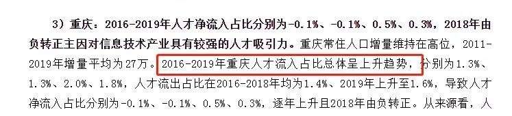 报告中关于重庆的数据提到:重庆2016~2019年人才净流入占比分别为-0.1%、-0.1%、0.5%、0.3%,2016年2017年,重庆人才微弱净流出,而到了2018~2019年,重庆的人才流入开始转正。