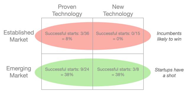 这跟克莱顿·克里斯滕森(Clayton Christensen)在《创新者的窘境》里面注意到的东西有点类似。克里斯滕森曾观察过做新型磁盘驱动器公司的生存率,发现进入新市场的初创企业相对于只是应用了新技术的初创企业更有可能取得成功。