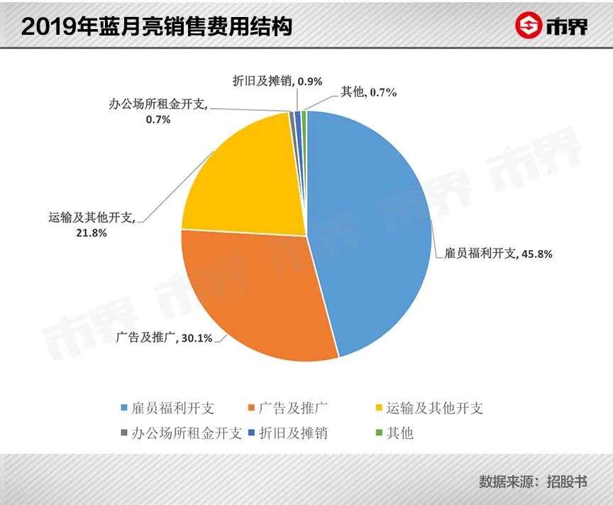 2017年至2019年,蓝月亮销售及分销开支分别为20.69亿港元、25.48亿港元、23.23亿港元,分别占同期收入的36.7%、37.6%、33.0%,也就是说,销售费用率呈下降趋势。