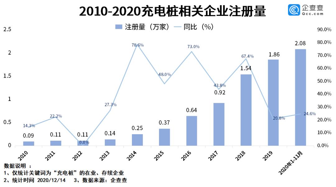 2020 年的政府工作报告提出,要加强新型基础设施建设(即新基建),发展新一代信息网络,拓展 5G 应用,建设充电桩,推广新能源汽车,激发新消费需求、助力产业升级。充电桩因此大火,行业又涌入不少新玩家。根据企查查消息,近十年来充电桩相关企业注册量逐年攀升,2019 年新注册量已达 1.86 万家,今年前 11 月新增企业 2.08 万家,同比增长 24.6%。