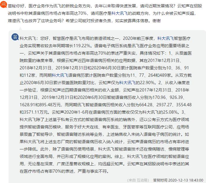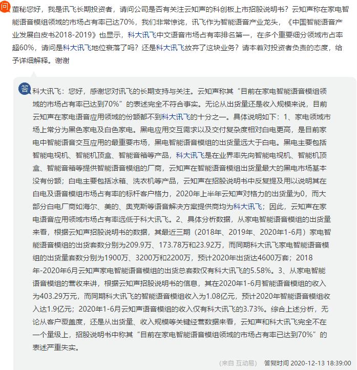 12月13日,科大讯飞在投资者交流平台上表示,云知声关于其语音病历市场、家电智能语音模组领域占有率高达70%的表述严重失实。科大讯飞对投资者回复中称,无论是在深度、广度还是营收规模上,科大讯飞在医疗、家电语音应用领域的智能语音应用,均远超云知声。