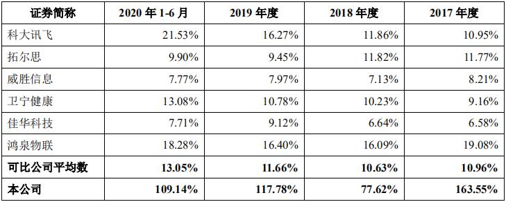 云知声的高投入,也让其研发费用率接近行业平均水准10倍。2017-2020年1-6月,可比公司平均研发费用率分别为10.96%、10.63%、11.66%、13.05%;同期云知声的研发费用率水平分别为163.55%、77.62%、117.78%、109.14%。