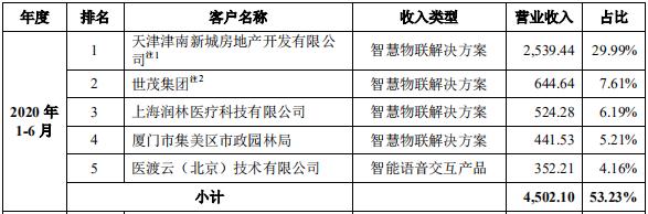 值得注意的是,云知声还存在依赖关联方世贸集团及其关联方情形。2020年上半年,云知声来自第一、二大客户的营收占比合计为37.6%。根据招股书,天津津南新城房地产开发有限公司为世茂集团持股25%参股公司。