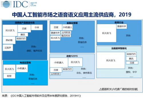 IDC发布的《中国人工智能软件及应用市场半年度研究报告(2019H1)》中显示,在中国人工智能市场之语音语义应用的主流供应商中,科大讯飞在教育行业、法庭庭审智能化领域占据着最高市场份额,在消费级产品制造市场、金融业客服、政务等行业同样占据主流市场份额。