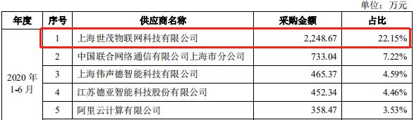 2020年上半年,云知声前五大供应商中,世茂集团旗下另一子公司上海世茂物联网科技有限公司为其第一大供应商,采购金额2248.67万元,占总金额22.15%。
