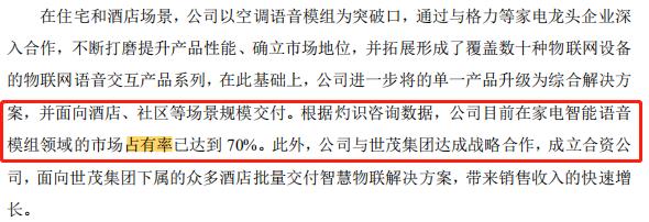 11月3日,云知声向上交所提供了招股书,申请在科创板上市。在招股书中,云知声表示公司持续深耕人工智能语音领域,在智慧生活的子领域白电市场,根据灼识咨询研究数据,公司通过与格力等白电巨头合作,市场占有率高达70%。