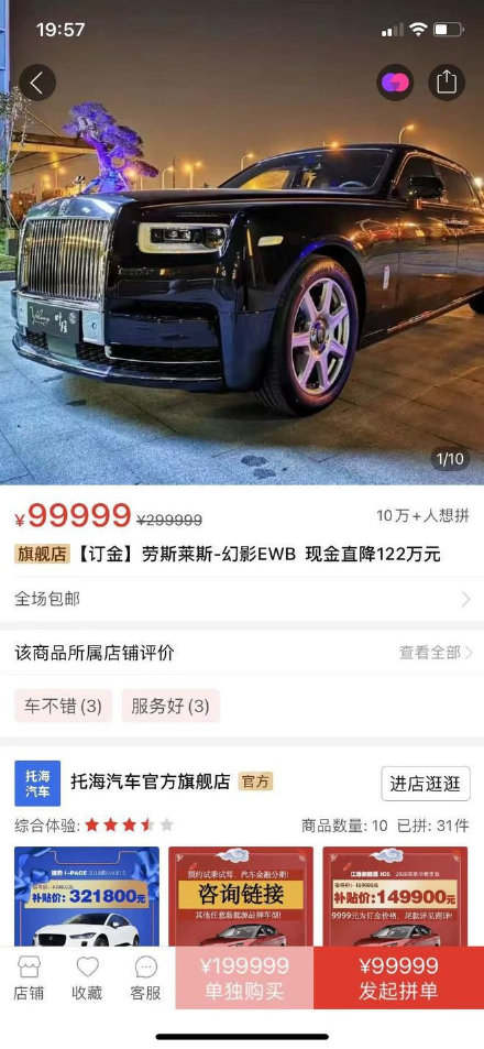 近日,拼多多平台上一家名为“托海汽车官方旗舰店”的店铺售卖劳斯莱斯幻影,配置价1068万元,直降122万元,补贴后仅946万元。劳斯莱斯方面对此回应表示:“在不伤害消费者利益和劳斯莱斯品牌形象的前提下,我们愿意看到电商平台和商家针对产品销售和宣传的不同尝试。”