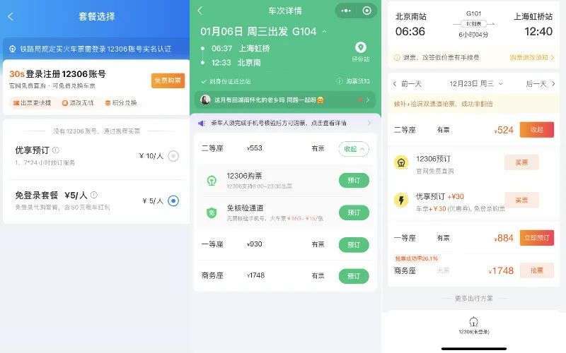 从左到右分别为携程、同程旅行、飞猪的火车票页面