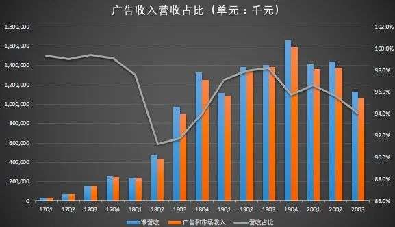 趣头条的营收由广告和市场收入,以及其他收入两部分构成。其中广告和市场收入是主要收入来源,贡献的营收占比超9成。