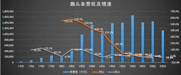 财报数据显示,该公司三季度实现11.3亿元的营收,较去年同期的14.1亿元,下降20%,较上一季度的14.4亿元,下降22%。趣头条自2019年Q3,营收增速呈现断崖式下滑,今年三季度更是出现了负增长的情况。