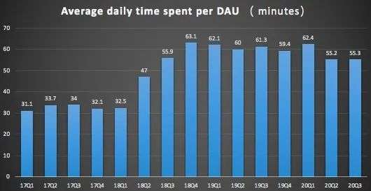 2019年Q4用户每天使用时长为59.4分钟,低于2018年Q4的63.1分钟。2020年Q1是新冠疫情爆发最严重的时候,人们居家隔离,闲暇时间增多,趣头条用户的花费的时间有所增加,从2019年Q4的59.4分钟,增加到62.4分钟,但依旧低于低于2018年Q4的63.1分钟。到了Q2和Q3,使用时长减少到了55.2分钟和55.3分钟。