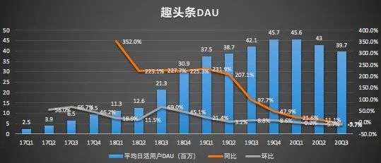 同时,趣头条日活用户也呈现下滑趋势。财报显示,2020年三季度趣头条的日活跃用户(DAU)为3970万,较上一季度的4300万,减少330万。