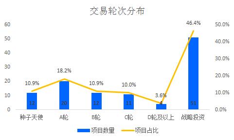 从融资轮次看,项目集中在战略投资(51笔,占46.4%),其次是A轮(20笔,占比18.2%)。其中战略投资的占比较上周大稍有增加,C轮投资占比较上周有所增加。