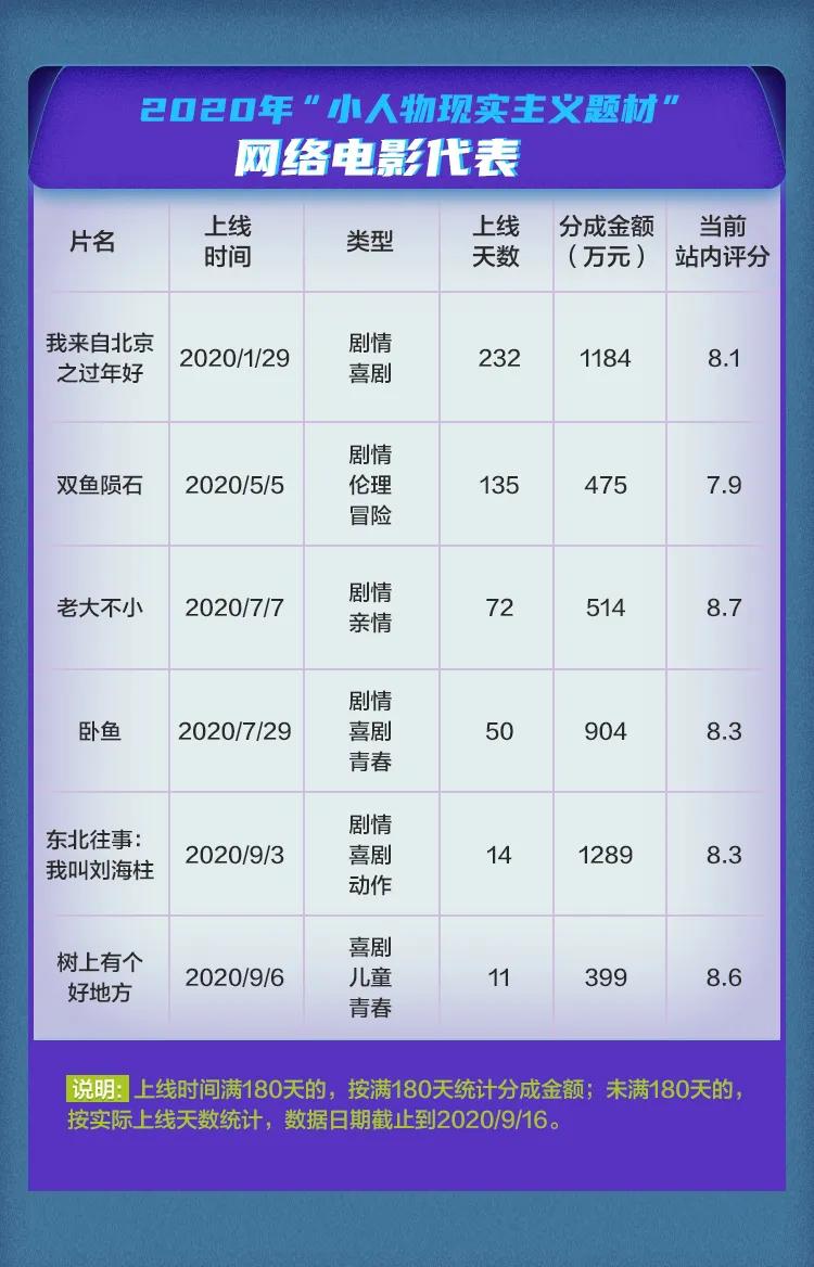 种瓜得瓜,种豆得豆,细看这些拿到了高票房分账的项目,或多或少都有其可取之处。一句话总结,2020年网络电影内容,IP占据优势,古装奇幻领先,现实主义题材实现阶段性的突围,提质减量实现了阶段性胜利。