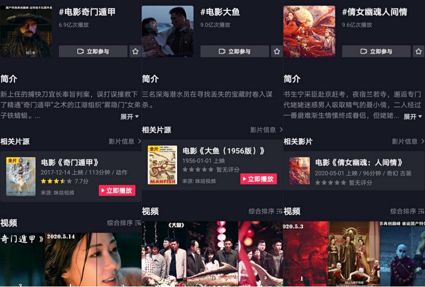疫情使然,线上玩法也如火如荼。短视频的告诉发展带动了影视综的曝光,网络电影X短视频,尤其是抖音,在这一年,迎来了一个阶段性的迸发。以影片《大鱼》为例,该片票房贡献率单日最高达28%,抖音的话题总量9亿+,算是网络电影成功进驻新媒体阵地的案例。同样的还有《奇门遁甲》和《倩女幽魂》,前者凭借老板娘的美腿在抖音小出圈,后者则是重现聂小倩和宁采臣的经典爱情,抖音上相关话题视频播放量高达9.6亿。