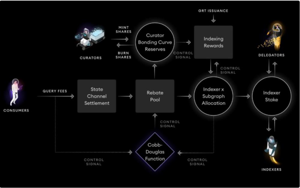 在The Graph网络中,整个生态主要包括消费者、索引者、指引者以及委托人。在这四类角色中,消费者(用户)支付费用(可以支付ETH或DAI,不过最终是以GRT进行结算)进行查询;索引者运行节点赚取查询费用和节点奖励;指引者(Curator,可以是子图开发人员、数据消费者或社区成员)存GRT来指明哪些子图值得索引;委托人把币质押给节点赚取收益。