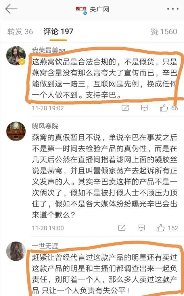 而且一个关键点在于现在已经不是职业打假人的时代。在燕窝事件风波中,辛巴粉丝的一波骚操作可以说尽显智商。不少人在社交平台纷纷留言支持辛巴,他们到现在依旧认为这是“小错误”,觉得竞争对手“故意黑他”,甚至还有人在私信中威胁和辱骂曝光者。一位网友称,你们想想起码他卖的不管是糖水还是勾兑水,起码能吃,感觉这都是对粉丝最大的回报了。