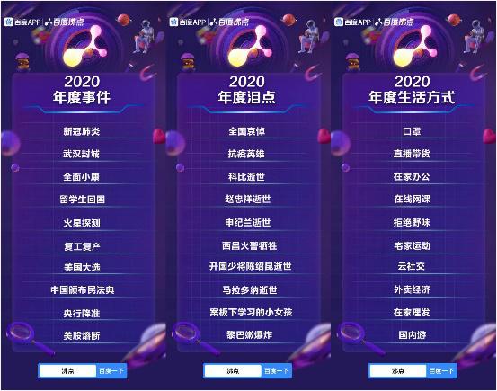 当你抽取一些百度沸点的关键词进行联想时,可以拥有相当多的组合形式。譬如:今年年初,“疫情”陡然中断人们平静的生活,“武汉封城”,“抗疫英雄”驰援,国际疫情阴霾下,“留学生回国”多艰。而疫情也潜移默化改变着人们的日常生活,“口罩”的重要性可以与手机相提并论,并催生“在家办公”、“在线网课”、“外卖经济”等新的场景和服务。
