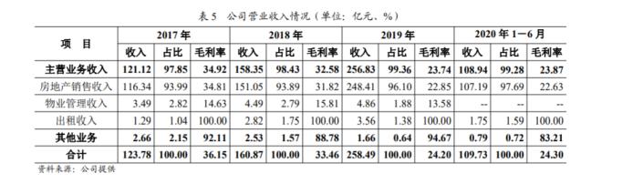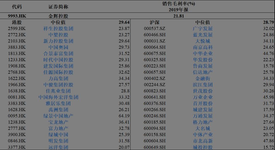 据招股书数据显示,2019年金辉的营业收入为259.63亿元,其中销售毛利率为21.81%,低于港股上市内房企29.47%的中位数,并远低于同规模的港股内房企。