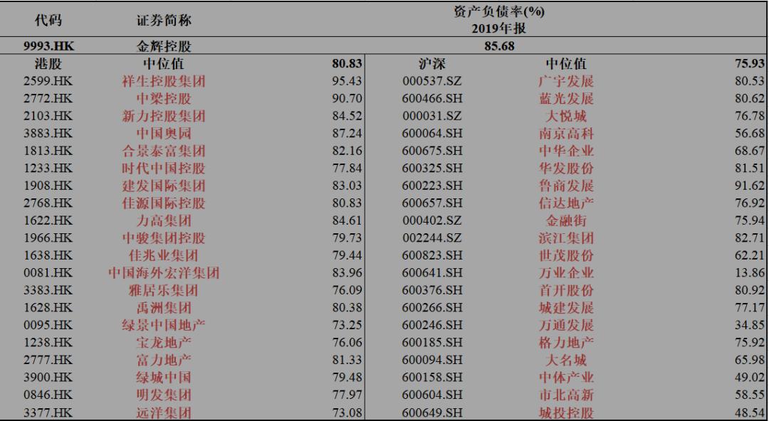 据统计在港股,内房企的资产负债率的中位数是79.44%,而金辉的资产负债率是85.68%;而相较于A股75.93的中位负债率,金辉也高出10%有余。