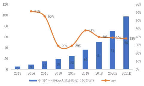 根据Gartner的数据统计,2019年全球SaaS服务市场规模达到1021亿美元,相较于2018年的857亿美元增长了46%。预计到2022年,全球SaaS服务市场规模可达1383亿美元,2019-2022年复合增长率11%。2019年中国企业级SaaS服务市场规模达到51亿美元,相较于2018年的36亿美元增长了40%。