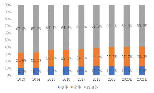 我国企业软件服务业仍处于初级阶段,软件和服务收入占企业IT支出的比重较小。2019年全球企业软件支出占IT支出比重为27.5%,软件与IT服务合计占比87.6%,硬件支出仅占12.9%。我国2019年企业硬件支出占IT支出的比重为42.2%,软件占比16.2%,软件与服务合计占比57.8%。从长期来看,我国企业IT支出结构还有很大调整空间。由于SaaS服务具有成本低、方便快捷、协同效应强等优点,能够解决部分企业应用软件的痛点,因此SaaS服务的发展能够带动我国企业软件渗透率提升,不断提高我国企业信息化水平。SaaS服务基于其优点将带动我国企业软件业进入黄金增长期。