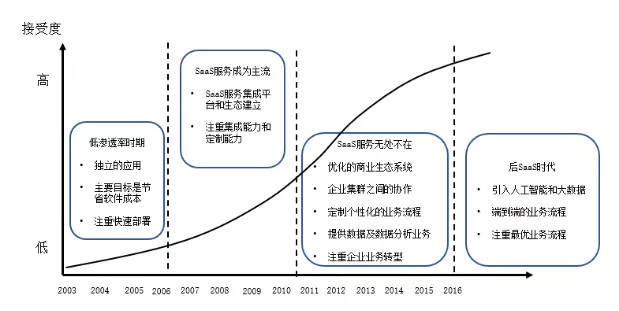 第四阶段:2016至今,可以称为“后SaaS时代”。SaaS产品作为单一的经营管理工具,功能已经开发较为完全,未来将注重与人工智能和大数据的结合,为企业进行最优业务流程规划,并解决端到端的业务问题。在企业协同方面,能够做到手机端、电脑端无处不在的连接。