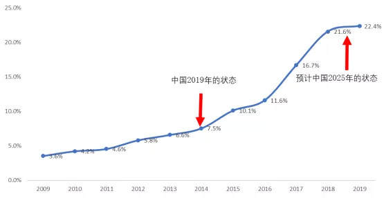 2009至2019年,全球GDP平均增速约为2.55%,全球企业软件平均增速约为6.89%,全球企业软件收入增速约为GDP的2.7倍。我们预计未来中国GDP的平均增速至少为5%,根据全球企业软件收入增速与GDP的倍数关系,预计2025年中国企业软件市场规模有望达到1.1万亿元。参考全球(主要是欧美市场)SaaS服务的渗透率曲线,中国SaaS服务的发展大约落后欧美5年,预计到2025年中国SaaS服务渗透率可达22%,预计SaaS服务市场规模可达2450亿元,约合美元370亿元,2020年至2025年复合增长率约39%。