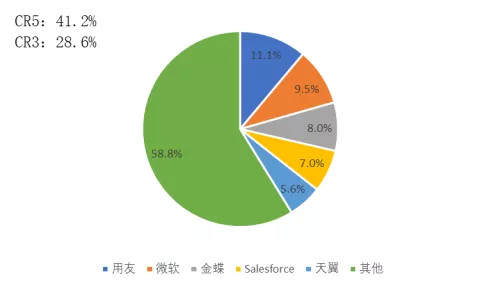 1H19,我国SaaS服务市场规模排名前五分别为用友(11.1%),微软(9.5%),金蝶(8%),Salesforce(7%),天翼云(3.1%),CR5合计市场份额为41.2%,CR3合计市场份额为28.6%。1H18,我国SaaS服务市场规模排名前五分别为金蝶(5.1%),微软(5%),SAP(4.3%),Salesforce(4%),甲骨文(3.8%),CR5合计市场份额为22.2%,CR3合计市场份额为14.4%。SaaS服务是一个长尾市场,除了通用型软件,企业在各个垂直行业、各个业务环节,均存在丰富的需求。我国SaaS服务仍为发展初期,产品以通用型软件为主,马太效应明显,尚未到较为成熟的、百花齐放的阶段。因此,与全球市场相比,我国SaaS服务市场更为集中,并呈现出份额向龙头集中的趋势。