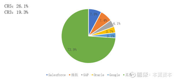 与IaaS服务高度集中相反,SaaS服务的市场格局较为分散。2019年全球SaaS服务市场规模排名前五分别为Salesforce(7.8%),微软(7.4%),SAP(4.15%),Oracle(3.7%)和谷歌(3.1%),CR5合计占比为26.1%,CR3合计市场份额为19.3%。