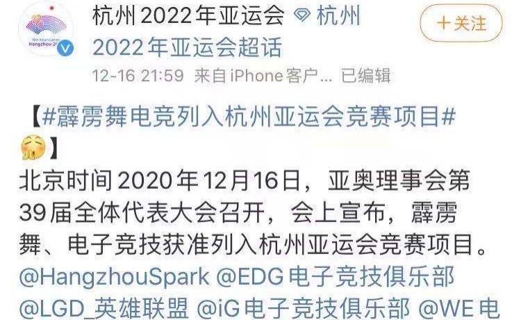 笔者发现,官方在宣布把电竞列入杭州亚运会竞赛项目的微博中,有提及杭州《守望先锋》战队 --- 杭州闪电队。