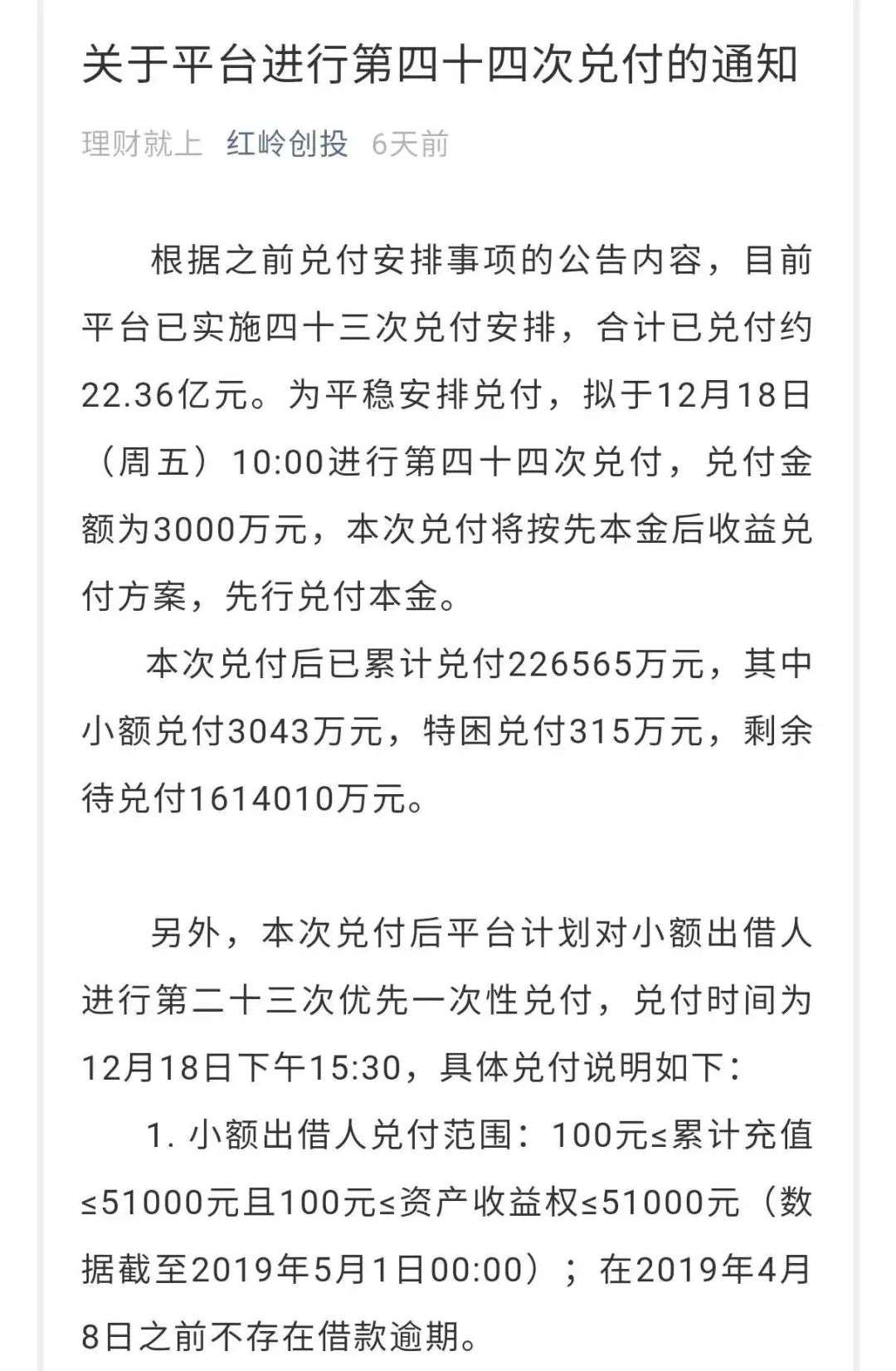 ▲红岭创投12月16日发布第44次兑付公告。
