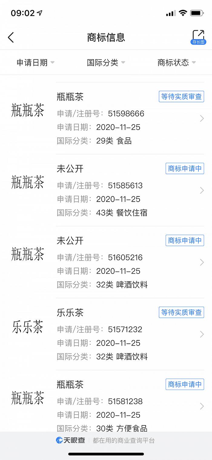 据天眼查APP信息显示,乐乐茶母公司、上海茶田餐饮管理有限公司于近日申请了“快乐茶”“瓶瓶茶”相关商标,注册相关分类包括啤酒饮料、方便食品等。