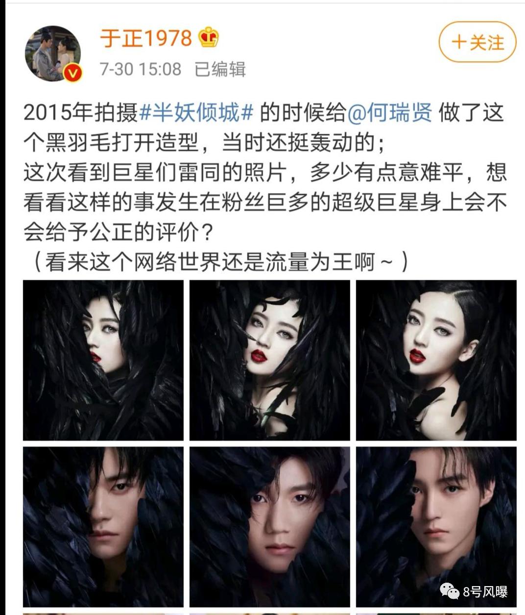 从力挺翟天临博士论文抄袭到指责TF boys演唱会造型抄袭他2015年《半妖倾城》给何瑞贤拍的定妆海报,再到时不时在微博上爆出圈内话题猛料,于正虽然没有作品播出但是一直在话题热点上,不完全统计2019年至今已经有超过72次热搜。