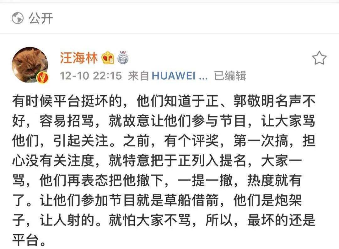 此前,汪海林曾发文表示,“有时候平台挺坏的,他们知道于正、郭敬明名声不好,容易招骂,就故意让他们参与节目,让大家骂他们引起关注。之前有个评奖第一次搞,担心没有关注度,就特意将于正列入提名,大家一骂,他们再表态把他撤下,一提一撤,热度就有了。让他们参加节目就是草船借箭,他们是炮架子,让人射的。就怕大家不骂,所以,最坏的还是平台。”