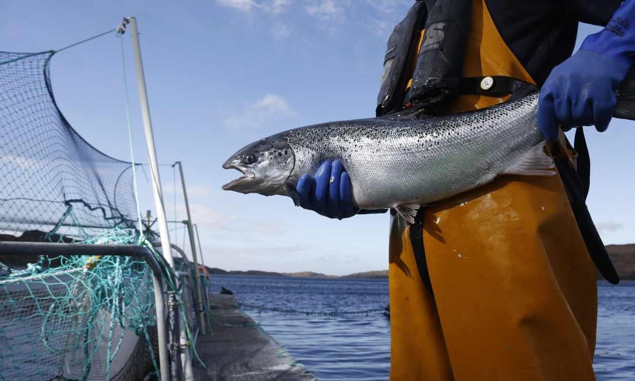 在苏格兰Loch Duart鲑鱼养殖场,工作人员手握的是一条养殖鲑鱼。图片来源:Murdo Macleod/The Guardian