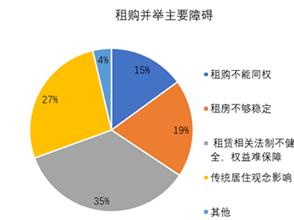 同时,在几类选项中,选择“租赁相关法制不健全,权益难保障”比例最高,达到35%,而且选择该项的比重在不同类型城市之间差异较小;随着城市等级的扩大,选择“租购不能同权”“租房不够稳定”的比重在显著提高。