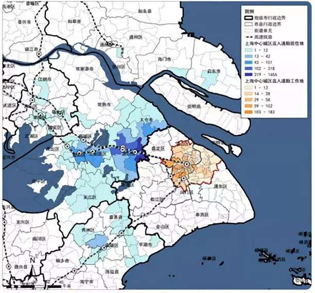 颜色越深的地方,代表着跨城流入上海的人越多。