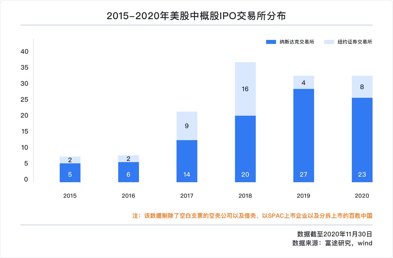 2020年登陆的市场中纳斯达克仍是主流,这主要是因为近年赴美上市的中国企业以高增长的成长科技企业为主。纳斯达克上市的要求相对宽松,科技型企业聚集,投资者对科技行业具备一定认知并愿意给出较高的估值,从而获得了许多中概股青睐。