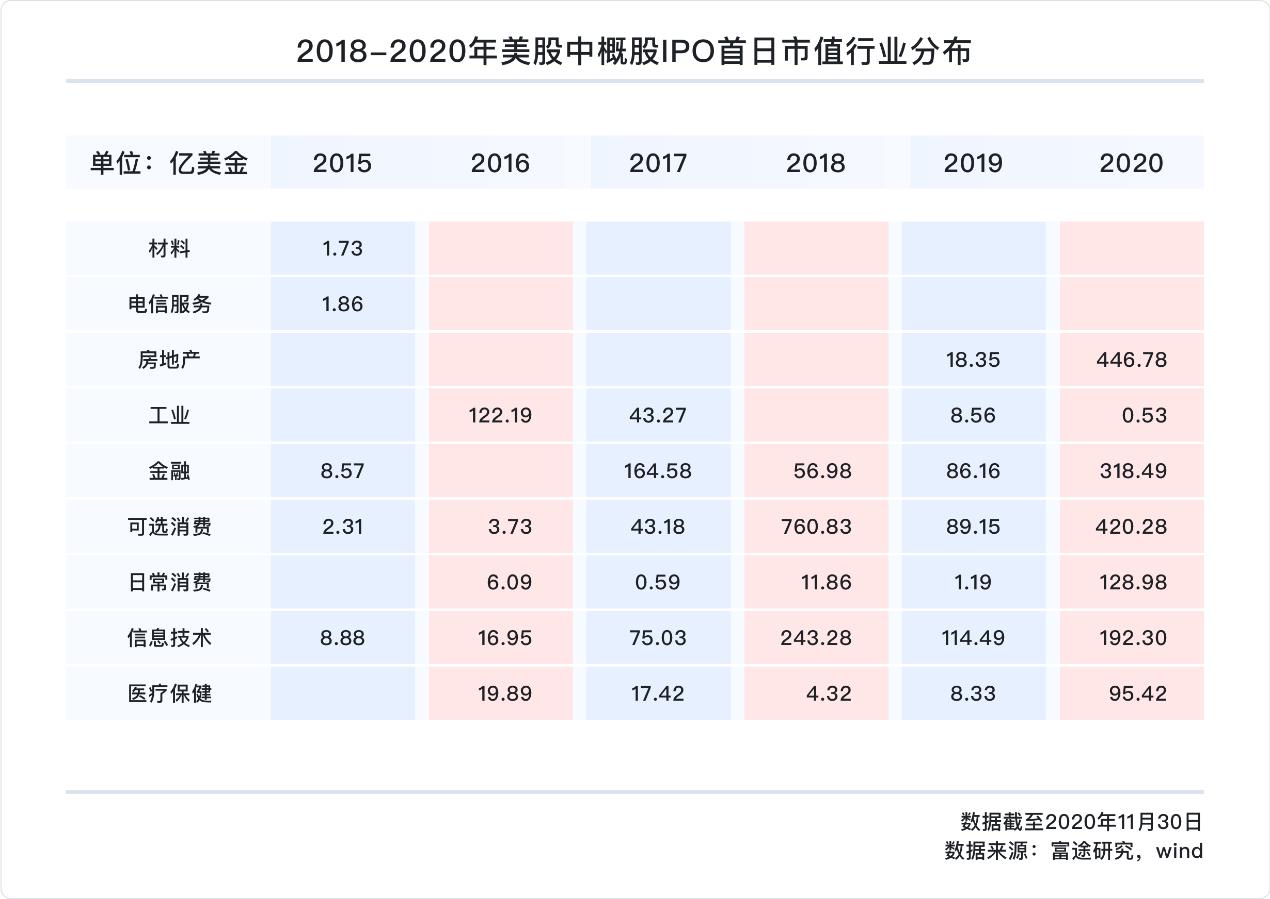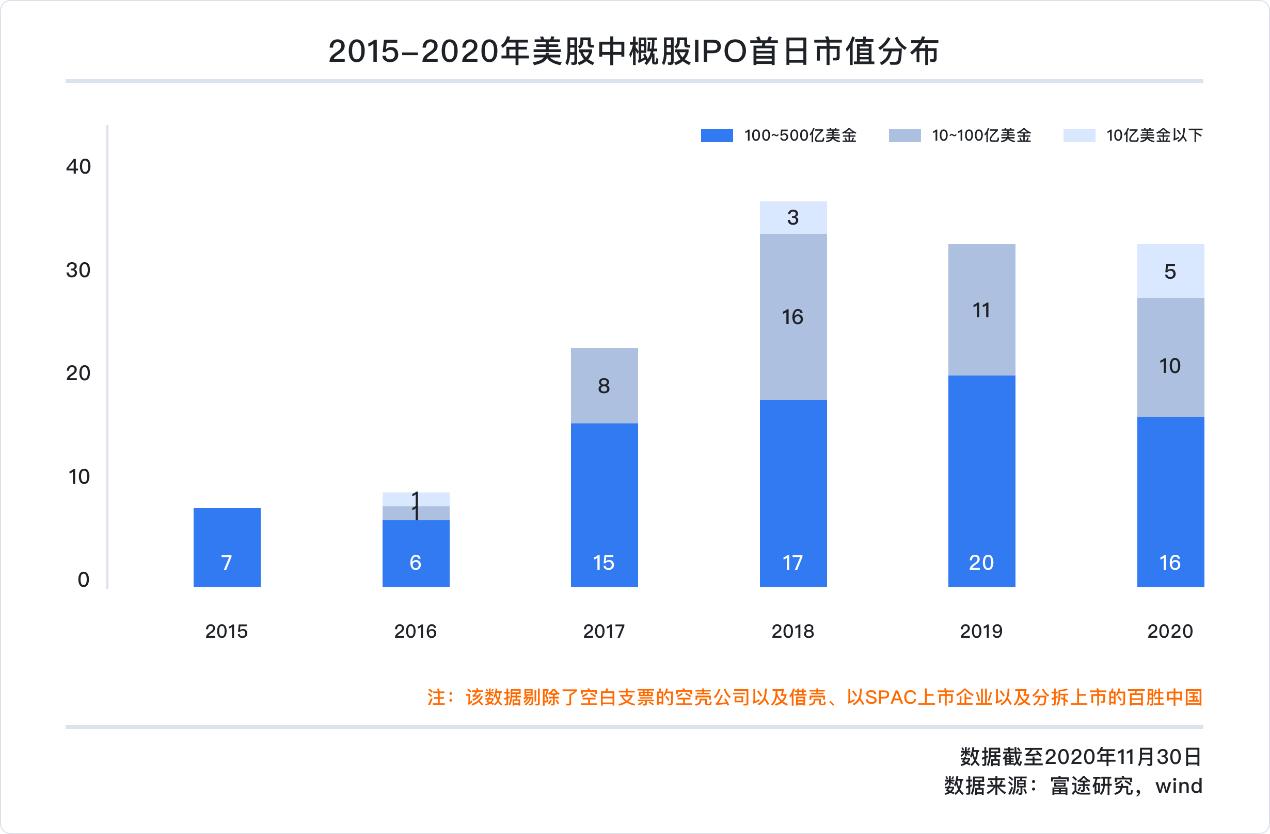 从市值分布来看,2018年和2020年是近几年中最星光熠熠的两年,2018年上市首日市值在100亿美元以上的有3家,而2020年则达到了5家。