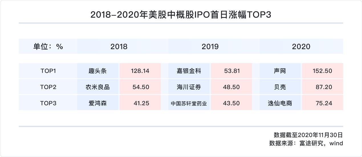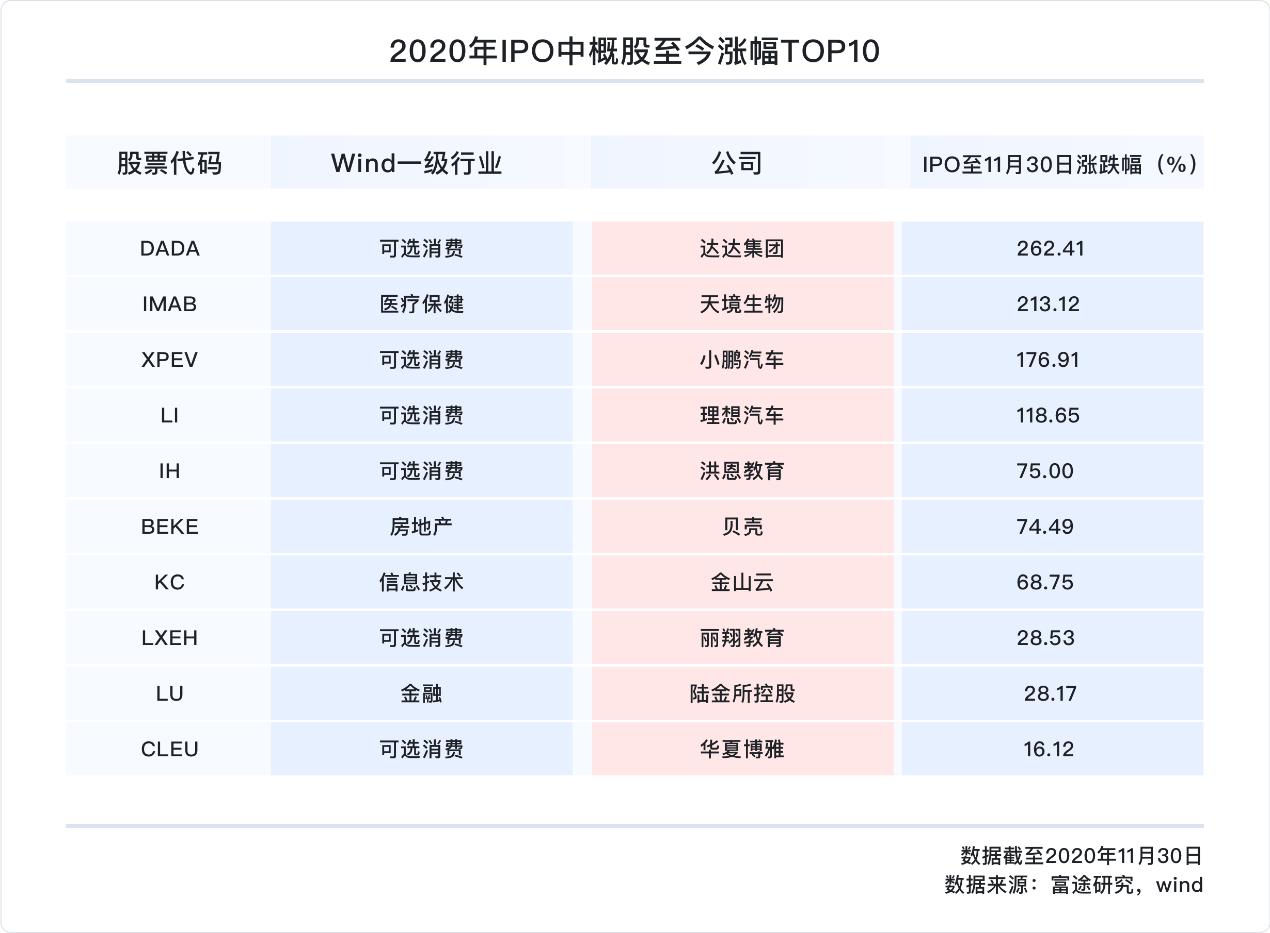进入2020年,即使是全球卫生事件的阴影下,叠加中概股屡遭做空和监管风险,但美股整体宏观环境向上,资金活跃,中概美股IPO热仍在持续。今年IPO的公司以细分领域的龙头公司为主,不少优质标的IPO首日大幅上涨。