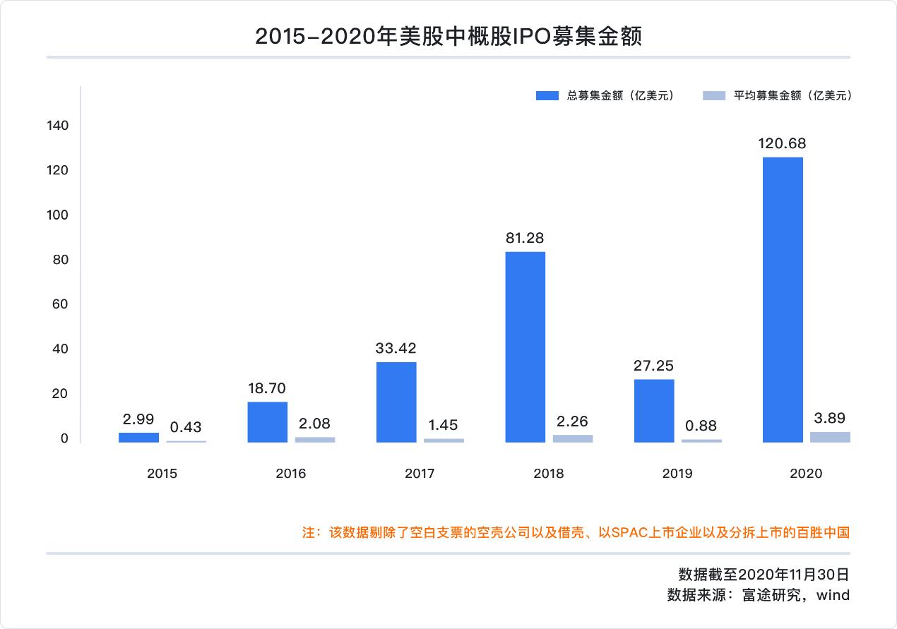 2020年是中概股赴美上市融资额创记录的一年,截至2020年11月30日,31家中概股狂揽超120.68亿美元,约2019全年4.4倍,走出2019年的阴霾。
