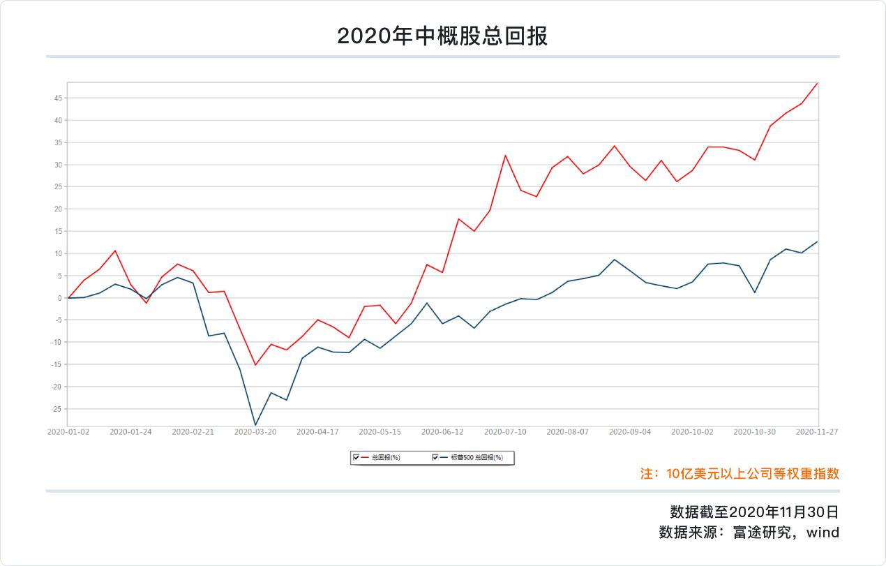 代表中国新经济的中概股,如果选取10亿美元市值以上中概股等权重的配置,在2020年大幅跑赢标准普尔500指数,体现了中国核心资产强大的竞争力。