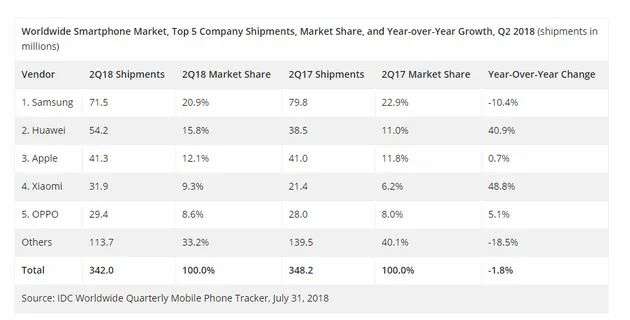2018年Q2全球手机销量排行榜,图源IDC