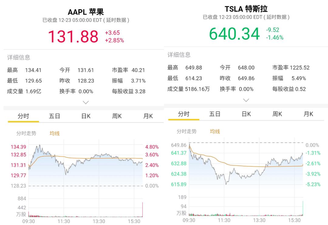 苹果与特斯拉股价,图源老虎证券