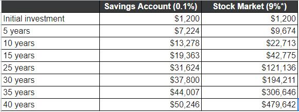 想象一下,你身边有1200美元,你不知道该怎么处理它。你听说过在股市可以获得不错的回报,但你的邻居告诉你,他曾经在投资上赔了钱,建议你离股市远点。你把钱存进储蓄账户,利息为0.1%。你每月多存100美元,一年总共1200美元。让我们看看四十年后会发生什么。