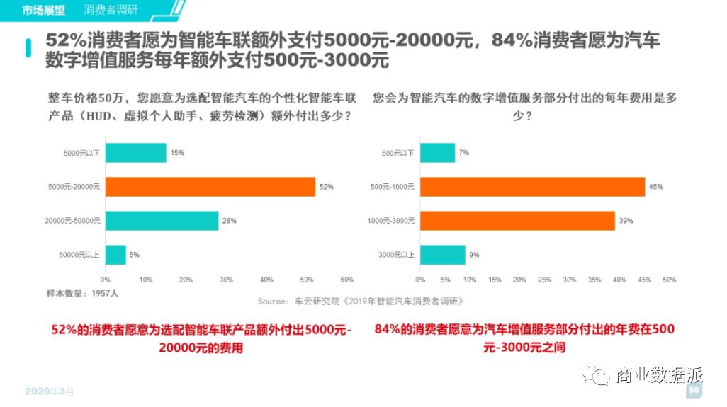 宏观层面,智能汽车是必然趋势,还有广阔的市场空间亟待填补。国家工业信息安全发展研究中心的数据显示,截止2019年12月31日,我国智能网联汽车新车型渗透率已达到40.1%,预计2020年中国智能汽车市场规模将达到1300万辆;微观层面,消费者对更智能的出行体验有较高的需求,车云研究院的调查报告显示,超半数消费者愿意为智能车联额外支付费用。