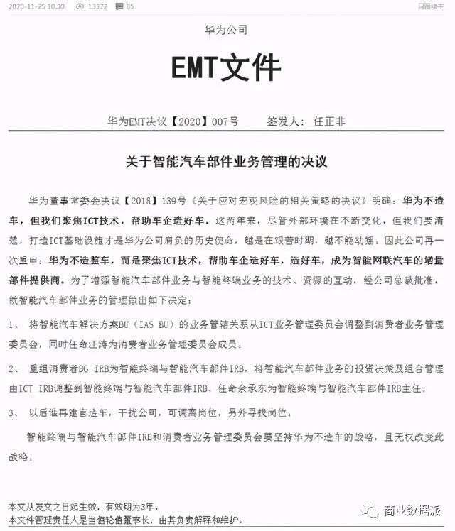 “华为不造车,聚焦ICT技术,成为面向汽车的增量ICT部件供应商,帮助企业造好车”,是华为成立智能汽车解决方案BU后对外界一直传达的核心信息。就在今年11月,具有一票否决权的华为创始人任正非更是罕见发言,在【2020】007号EMT文件中明确表态:“以后谁再建言造车,干扰公司,可调离岗位,另外寻找岗位。”任正非这一发言,一方面是让内部坚定方向,另外一方面也想让车企 “放心”。