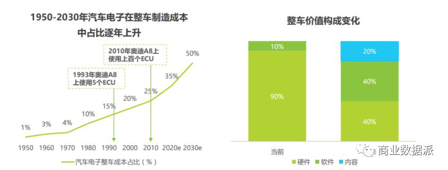 艾瑞咨询的最新报告指出,自1950年后汽车的电气化程度明显提升,预计2020时汽车电子(包括系统软件)占整车的成本将提升至35%。到2019年底,全球汽车电子市场需求达到2285亿美元,其中中国市场对汽车电子需求更是高达962亿美元,且还在以10.1%的速度高速增长(全球增速5.1%),仅仅汽车电子增值配件就能滋养出市值430亿美元的恩智浦等巨头。