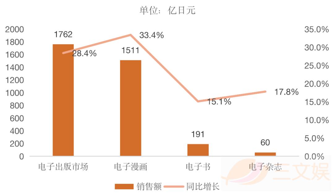 与之相反,只要接入网络,就可以不受空间限制进行创作和发行的电子出版市场上半年同比增长28.4%,达到111.51亿元(1762亿日元)。其中,电子漫画同比增长了33.4%,达到了95.57亿元(1511亿日元);电子书同比增长15.1%,达到了12.08亿元(191亿日元);电子杂志同比增长17.8%,达到3.80亿元(60亿日元)。